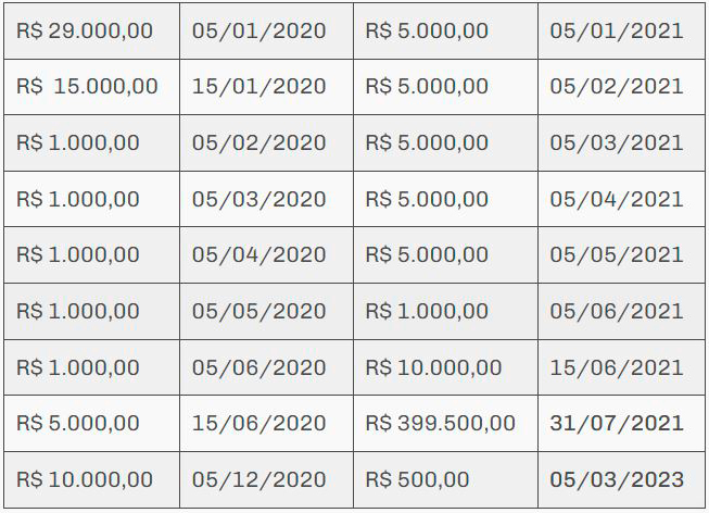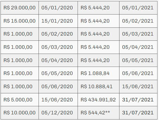 O contrato foi assinado em 05/01/2020, com previsão de entrega do empreendimento em 31/07/2021, mediante pagamento da parcela do financiamento, com o seguinte cronograma de pagamento: